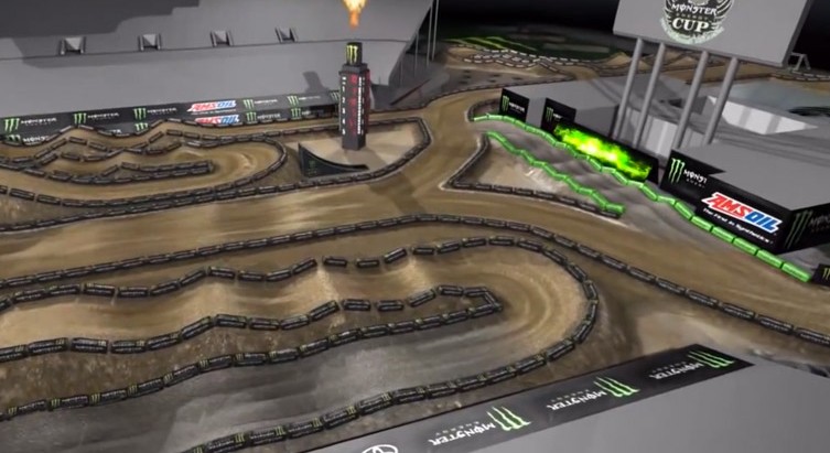 The Monster Energy Cup track will include the unique the split start, joker lane and a high-speed 33 degree bank built into the stands, but Carmichael has intensified a few more items. The 80′ triple will grow to 100′; instead of one high-speed sweeper turn, there will be two; the split start will now direct riders onto the track at a 45 degree angle.