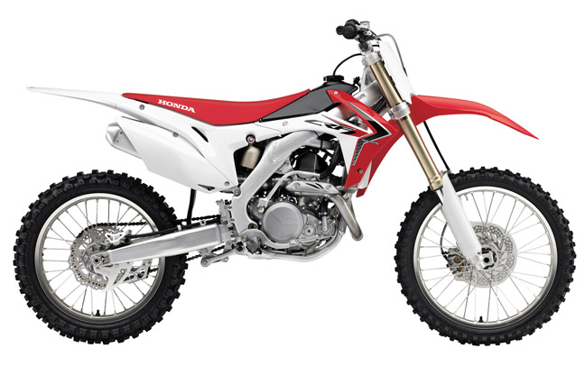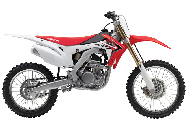 The 2014 CRF250R features an all-new engine and rolling chassis. The new frame is designed to lower the bike’s centre of gravity, incorporating a dual-muffler exhaust system to further sharpen handling by centralising the bike’s mass. A revised engine is claimed to add a load of mid-range punch, due to the additions of a new cylinder head, new piston, higher compression ratio, plus a new dual-timing fuel injection system, and a new transmission. New for 2014 on the CRF450R is the intake and exhaust ports, Dual-Timing fuel injection and redesigned muffler internals, claimed to boost torque output and increase throttle response. Also, in the suspension department, revised internals in the Kayaba Pneumatic forks claim to yield improved damping response for improved bump performance.