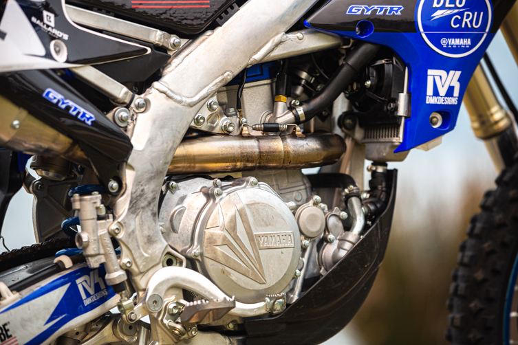 The plastic bashplate that comes standard on the WR450F offers decent protection. It’s a much better unit than its predecessors (mainly because of the added protection is gives the radiator hoses), but can be prone to ripping off if slammed hard enough. So to beef up the bike’s underside protection in extreme terrain, we fitted a GYTR Enduro Glide Plate. The beautifully made alloy guard bolts on to the existing mounts with two 8mm hex-head bolts, and offers way more protection for frame rails and engine cases. That said, the alloy is loud as all get-out when it hits obstacles. And it deflects more engine noise back to the rider, which can get annoying. So, unless we’re riding extreme terrain, we revert to the standard hard plastic bashplate.