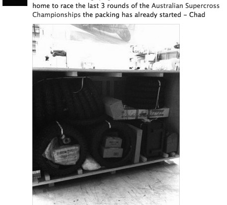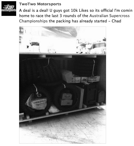 Doesn’t get much more official than an announcement via Facebook these days, eh? TwoTwo Motorsports’ Chad Reed’s crate of goodies is packed and ready to make the trip home, to race the final three rounds of the Australian Supercross Championships. All because the ASX Facebook page got 10,000 likes, though? Nup…