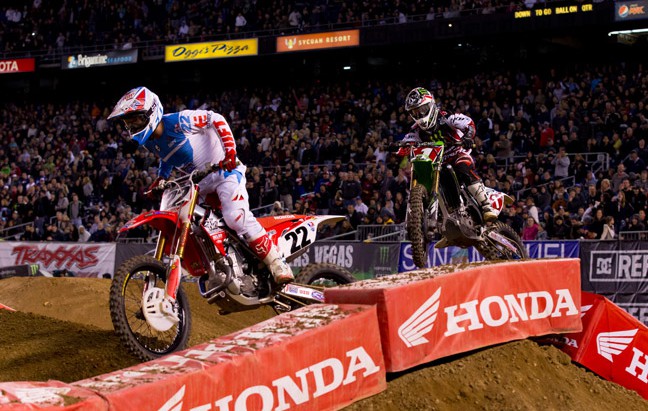 Reed and Monster Energy Kawasaki’s Ryan Villopoto were neck-a-neck when Reed attempted to seatbounce a section but couldn’t pull the nose up enough to stick the landing and went over the bars. After the crash Reed was holding his left knee and was carried off the track by the Asterisk Medical Crew.