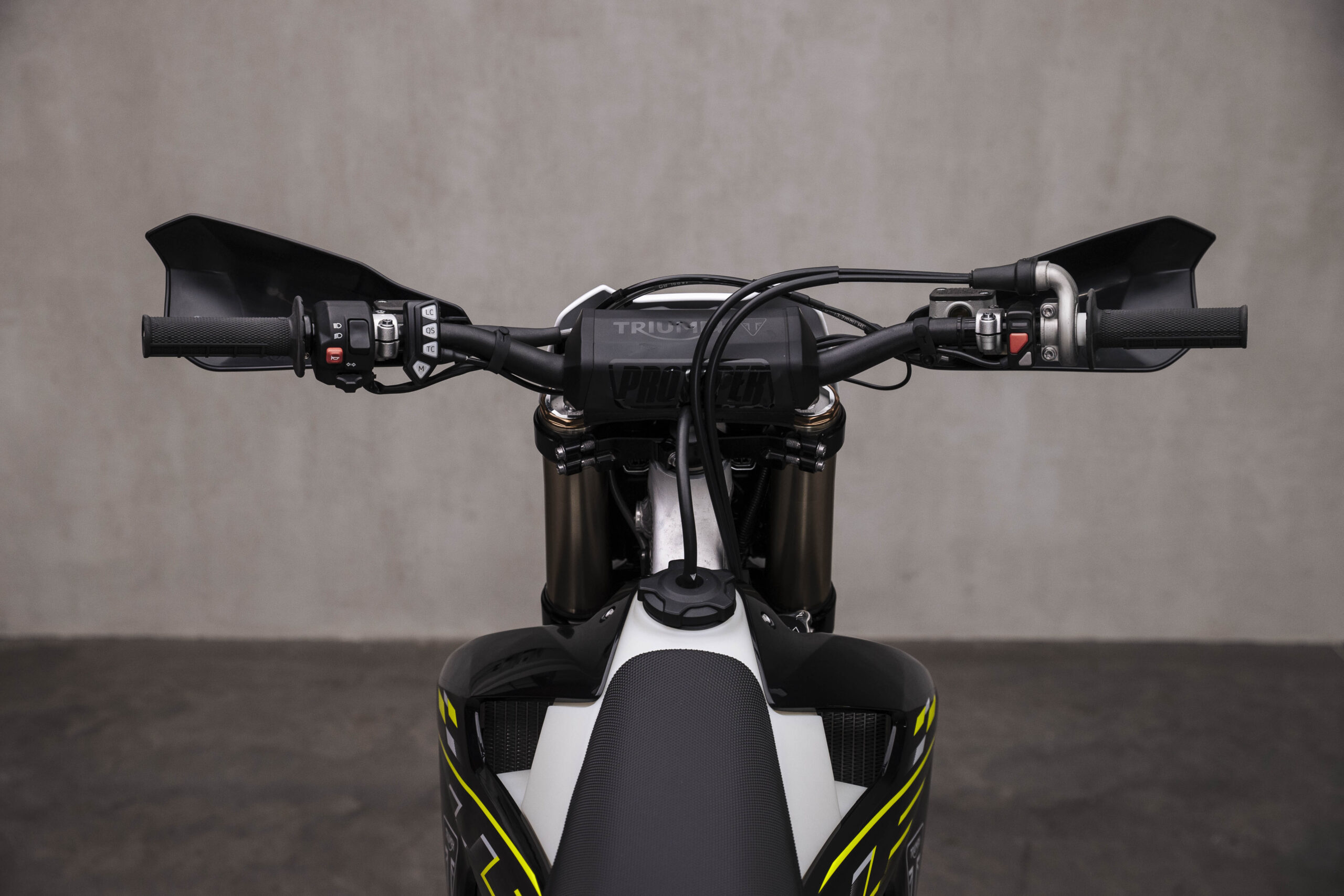 As you’d expect, the enduro bikes come with obvious differences to the MX models: an 18-inch rear wheel, wide-ratio six-speed gearbox, larger-capacity clear fuel tank, headlight assembly, hand guards and bashplate, instruments and switchblocks, etcetera. Interestingly (and unlike many other brands), Triumph’s enduro models also get different bodywork from their MX cousins – tweaked radiator shrouds and a 25mm longer rear guard. On top of that, the TF-E models also get significantly more engine inertia (via crankshafts that have a whopping 30% and 34% more inertia than their 450 and 250cc MX-model counterparts, respectively), plus a slightly larger-capacity airbox, revised mapping, and different exhaust systems to meet noise emission regs. But what fascinated us the most was what wasn’t different – in particular, how the rolling chassis used for enduro and MX models remains virtually identical. Admittedly, the enduro models get a 10mm longer swingarm and 10mm shorter fork (designed to shift more weight onto the front-end for tight-terrain agility, but retain straight-line stability at high speed), but the rest of the alloy “spine and double-cradle” alloy chassis is identical. And not just the frame; the triple clamps, steering stem, engine mounts, shock mount and shock linkage are all interchangeable between enduro and MX models.