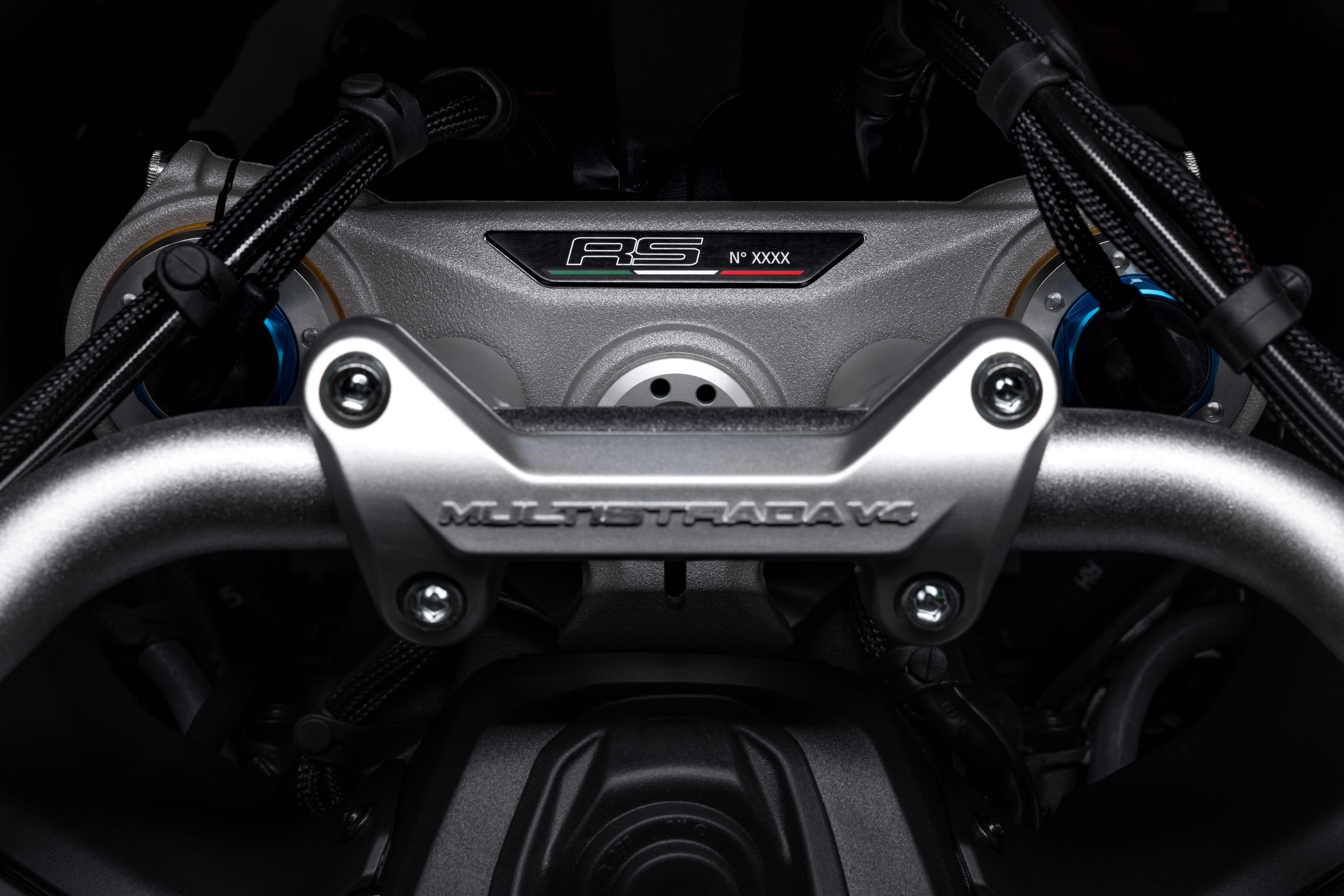 The Ducati Multistrada V4 RS is produced in a numbered series. The number is displayed on a black anodized aluminium plaque, embellished with the Italian flag, applied to the triple clamp. The Multistrada V4 RS will be available in a single trim level, featuring front and rear radars as standard, with the exclusive RS livery, in Australia from December 2025/January 2026. As with all models in the Multistrada family, on the Multistrada V4 RS Ducati also offers the exclusive “4Ever Multistrada” warranty, valid for four years with unlimited mileage, guaranteed by the entire Ducati dealer network throughout Europe.