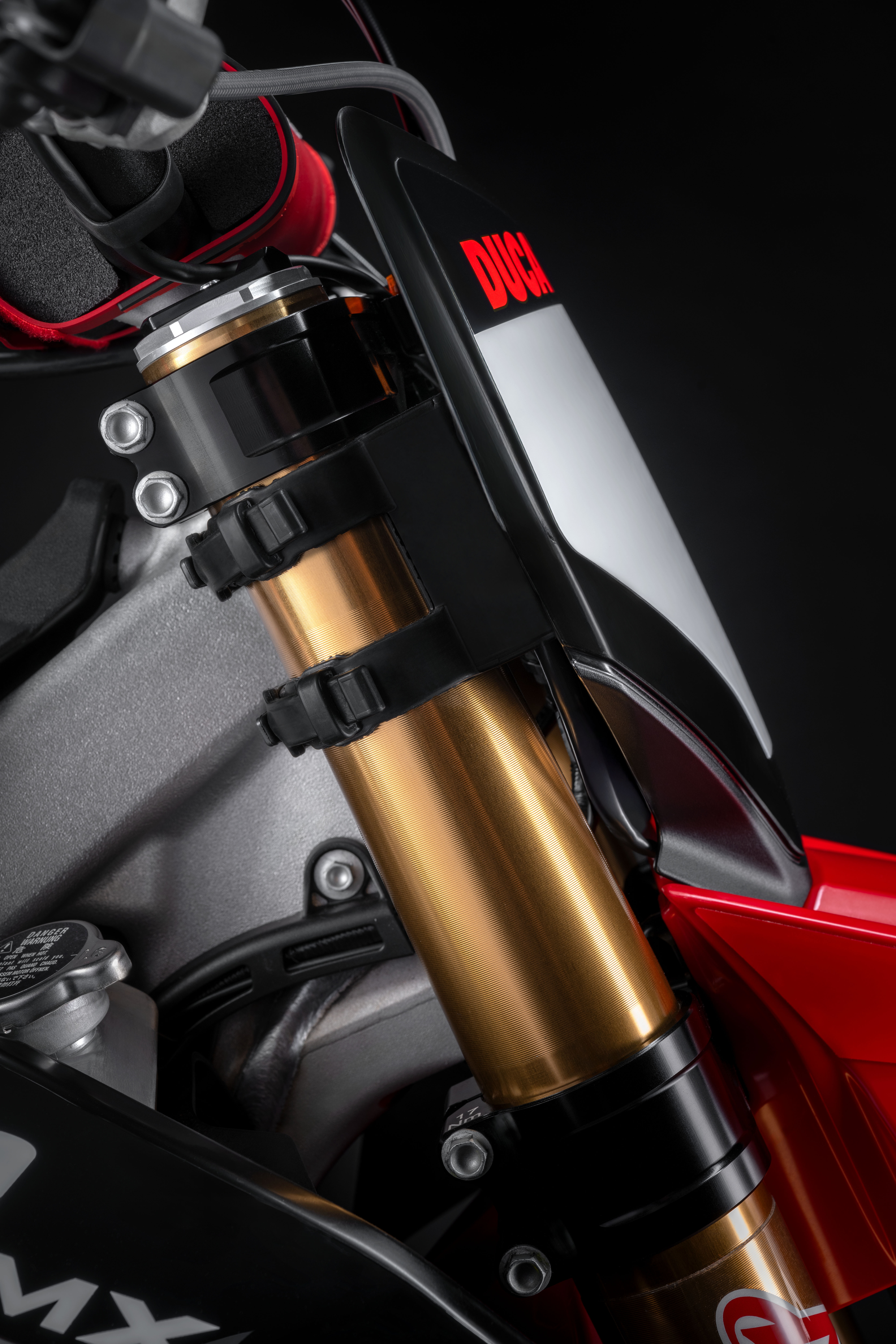 The holeshot device, available as standard on the Factory, compresses the front fork when starting, increasing stability and acceleration when exiting the gate. The WiFi module allows the rider to customise the Riding Modes through the X-Link app, defining all parameters – throttle map, launch control, engine brake and Ducati Traction Control. Finally, the Ducati Desmo450 MX Factory is even more beautiful and evocative thanks to the special Ducati Corse livery, which recalls that of the official bikes taking part in the MXGP World Championship.