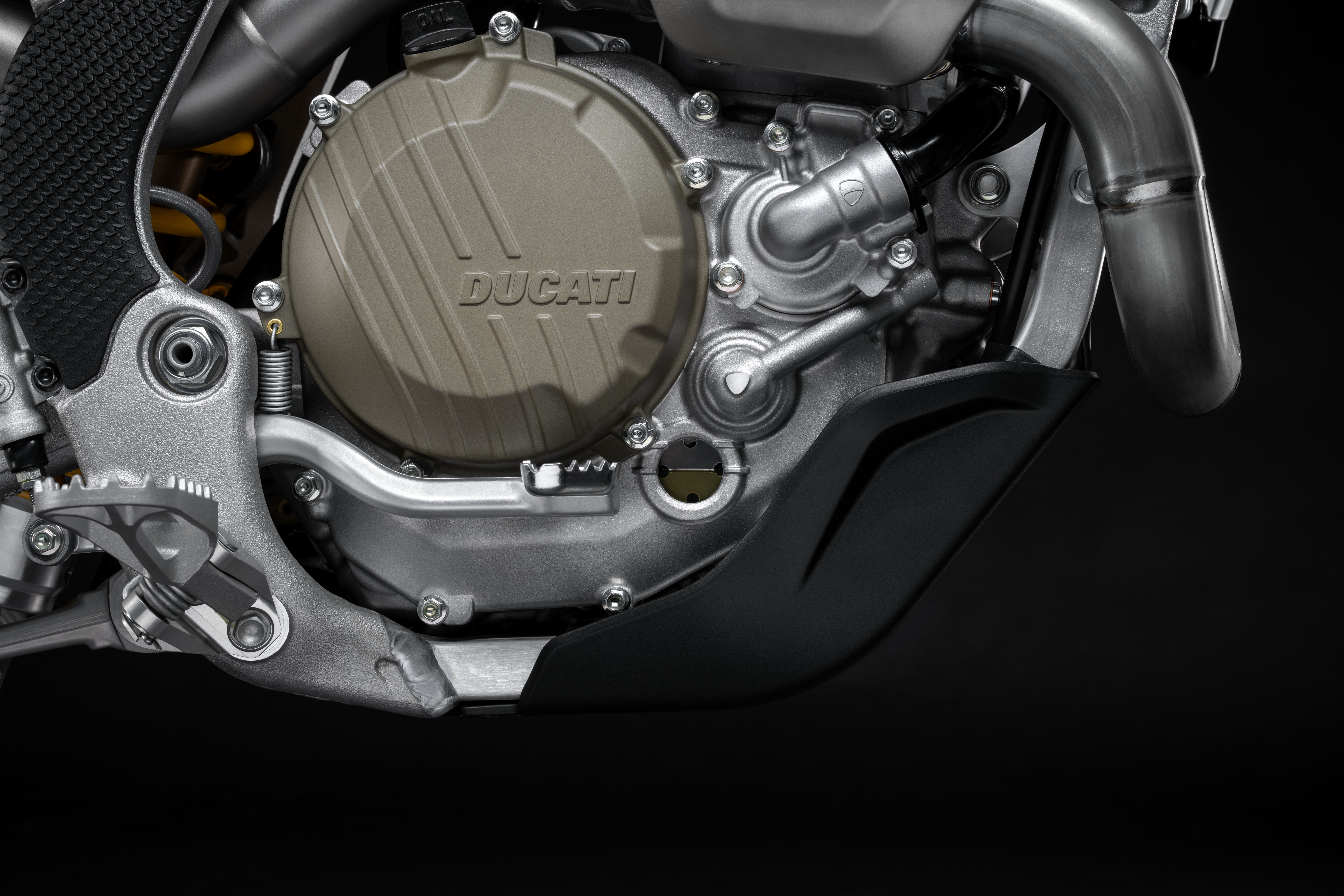 The experience in MotoGP and Superbike, where Ducati is a technological benchmark, has allowed the engineers at Borgo Panigale to introduce a genuine traction control system on the Desmo450 MX, offering benefits in terms of lap times, rider safety and energy savings when riding. Unlike the systems currently available in the segment, the Ducati Traction Control (DTC) implemented on the Desmo450 MX calibrates power cut-off according to the actual slippage of the rear wheel, thus ensuring effectiveness, responsiveness and linearity of intervention. This system is able to identify when it should not come into action, such as during jumps, and automatically disengages itself. Furthermore, if the rider identifies points on the track where he wants to be able to take advantage of the full performance of the engine, he can deactivate the system with a slight pressure on the clutch lever. The control will automatically re-engage a few moments later. Ducati Traction Control offers four different levels of intervention.