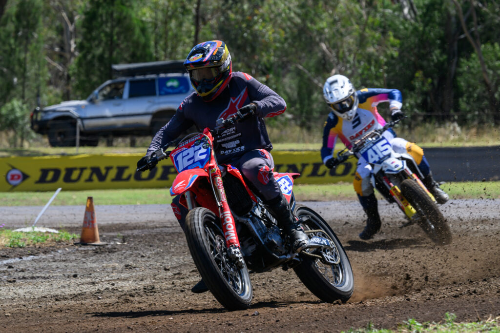 While Yamaha-mounted Dunker emerged from the Gunnedah TT track undefeated, scoring four victories on Sunday to beat local Daniel Wicks (KTM), the final round was all about the championship outcome. Thomas Herrick went into the round holding a decent points lead over Wicks, and as the rain cleared the tireless Gunnedah Motorcycle Club crew began preparing the track, the mood lifted with news that former points leader Tom Armstrong’s condition had improved overnight following his crash at Saturday’s Round 6.
