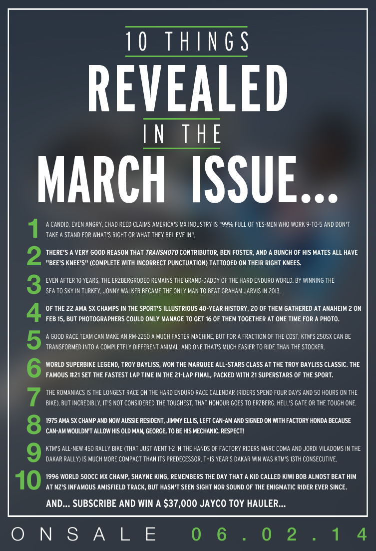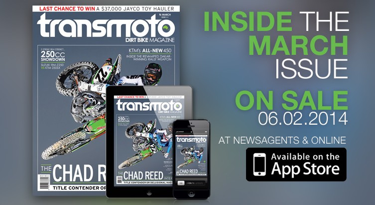 Inside Transmoto’s March Issue 12 years ago — To subscribe to Transmoto Dirt Bike Magazine‘s print and/or digital editions, click here. Articles, News Be the first to comment... CancelLog in to post a comment or sign in with Facebook Login with Facebook You might also like... Cassons 1 week ago WALSH MAKES FINKE RETURN WITH HONDA Five-time champ David Walsh joins 2025 victor Corey Hammond and podium finisher Brodie Waters. News 1 week ago YAMAHA FLEX AT WONTHAGGI OPENER Yamaha Australia’s motocross teams dominated Round 1 of ProMX, winning four classes and eight races. KTM 2 weeks ago SANDERS WINS RALLY-RAID PORTUGAL Red Bull KTM Factory Racing’s Daniel Sanders lead from start to finish to win Round 2 of the W2RC. News 2 weeks ago McLellan Claims Triumph’s First MX2 Win The South African secured his and Triumph’s maiden Grand Prix victory aboard the TF250-X in Spain. KTM 3 weeks ago KTM RACING READY FOR 2026 PROMX The orange team enters the 2026 ProMX opener at Wonthaggi with a motivated four-rider lineup. News 3 weeks ago MXGP DOUBLE PODIUM FOR TRIUMPH Triumph kicked off 2026 with Farres second and McLellan third overall in MX2 at the MXGP of Argentina. News 3 weeks ago TEAM AUS SET FOR OCEANIA MX DEFENCE Team Australia will chase a third straight victory at the 2026 FIM Oceania Women’s Motocross Cup. A1 3 weeks ago RACELINE HUSQVARNA PARTNER WITH YOSHI Yoshimura Australia partners with Raceline Husqvarna TDUB Racing for the 2026 Aus ProMX Championship.