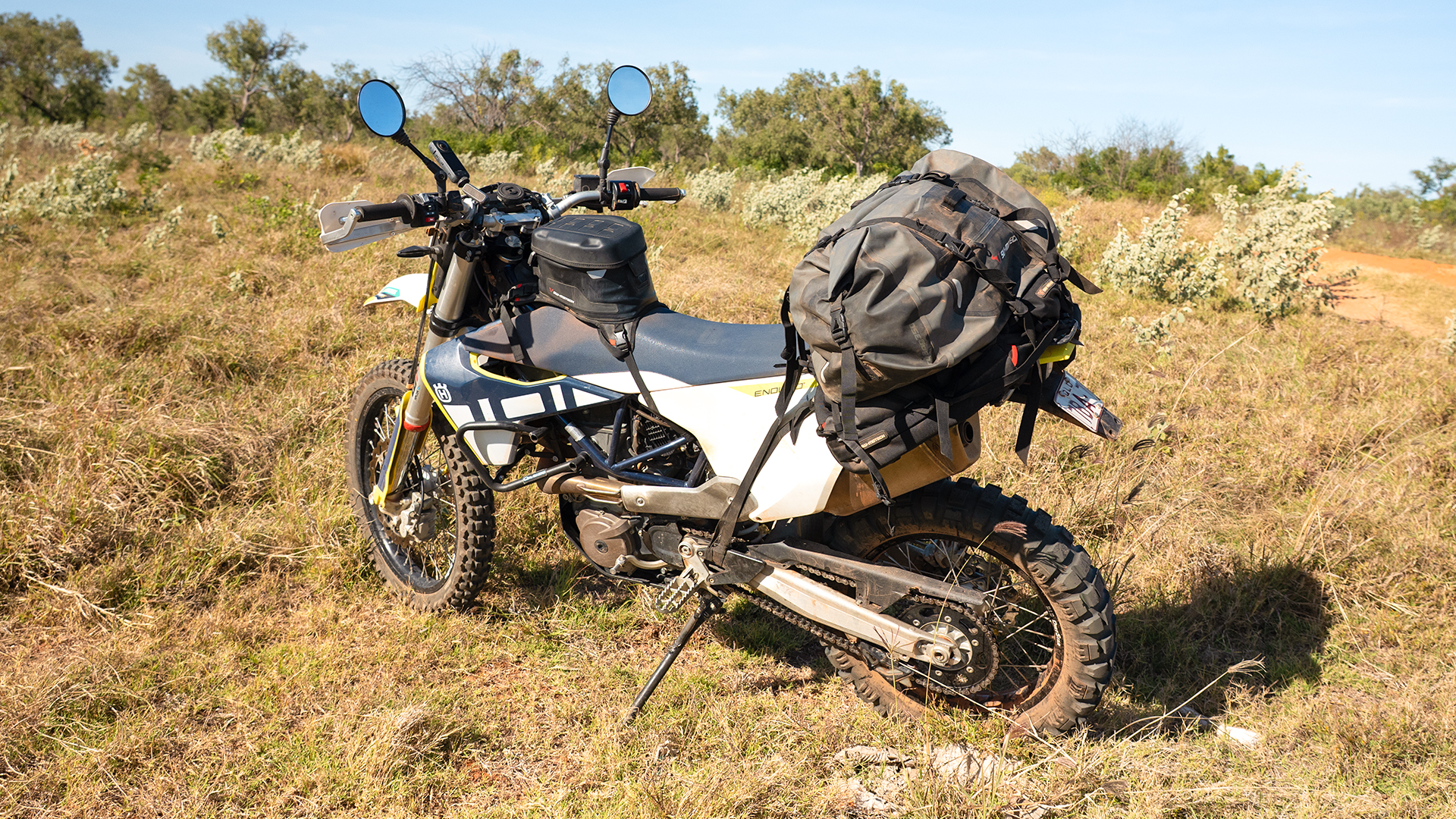 Ted’s Husqvarna 701 ran a leaner set-up befitting the lighter bike. The Pro Cross WP strap tank bag (5.5L) for quick-access items, a Drybag 350 tail bag (35L) for his personal kit, and the Pro Cargobag tail bag to round out the load. Different bikes, different needs, but the same German engineering keeping their gear secure and protected.