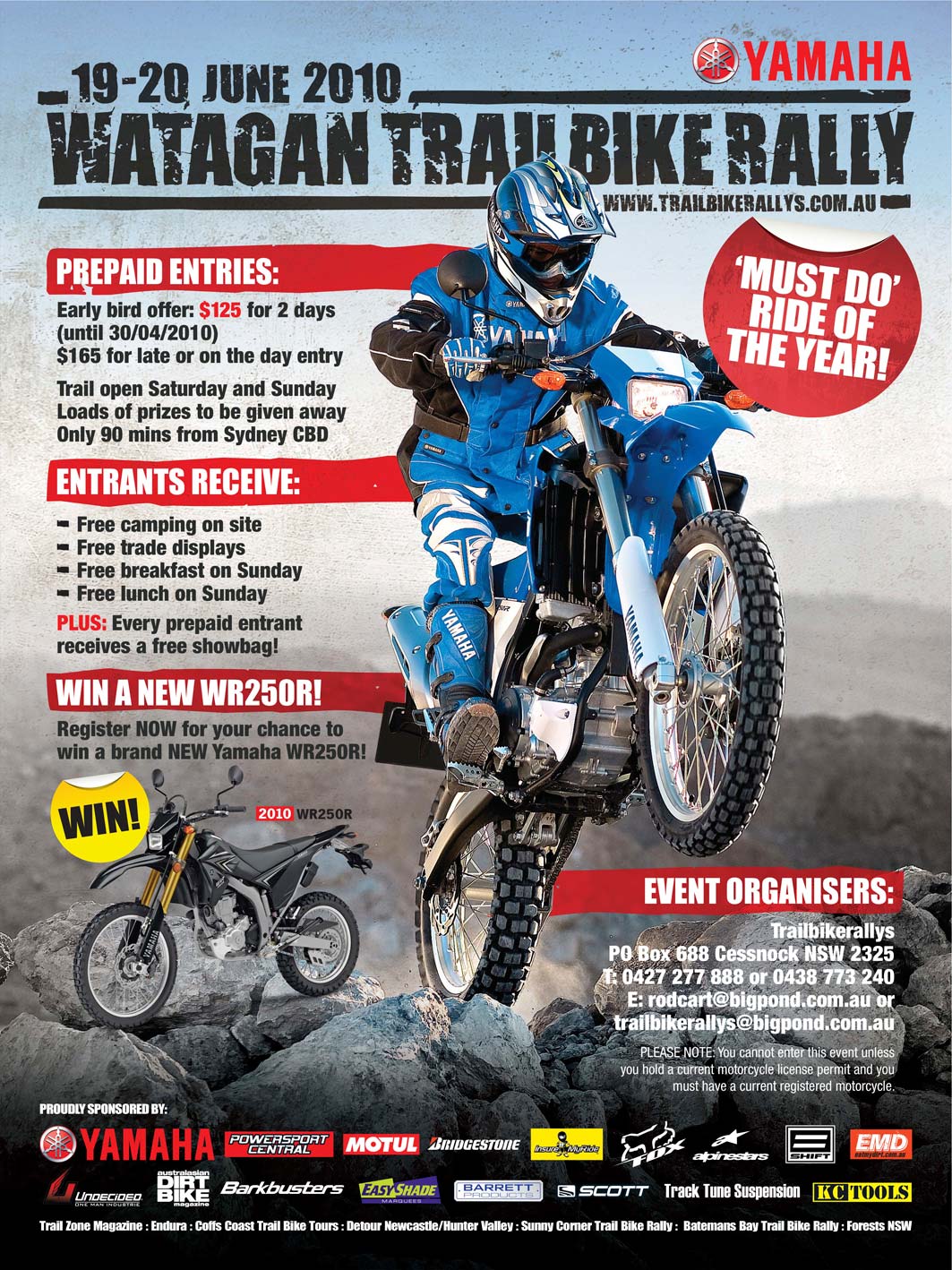 The Watagan Trail Bike Rally is coming up on 19/20th of June, and it’s shaping up to be better than ever. Every entrant receives free on-site camping and breakfast and lunch on Sunday, as well as going into the draw to win a new Yamaha WR250R. The cost of the two days is $165, which you can pay for on the day. The Watagan State Forrest is only a 90 minute drive from Sydney, and half-an-hour from Newcaslte.